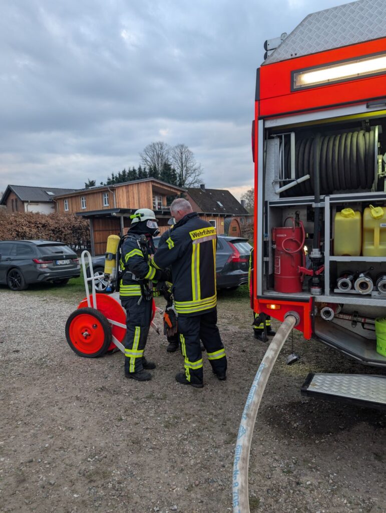 Das Löschgruppenfahrzeug der Feuerwehr Havetoft-Hostrup machte sich kurze Zeit später mit sieben Einsatzkräften auf den Weg zum Einsatzort. Dort angekommen, musste umgehend eine Löschwasserversorgung vom Tank des Havetofter Fahrzeugs zur Pumpe des Tarper Löschgruppenfahrzeugs hergestellt werden. Kurz zuvor hatte sich ein Rohrbruch ereignet, so dass die Wasserversorgung nicht mehr sichergestellt war. Zeitgleich rüsteten sich die Atemschutzgeräteträger aus und warteten im Bereitstellungsraum auf ihren Einsatz.