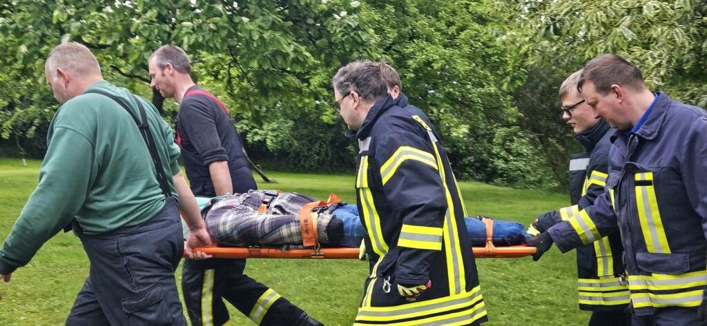 Rettung mittels Spineboard, Transport ins Feuerwehrfahrzug und Erstversorgung (Bilder: Sandra Sarnowski)