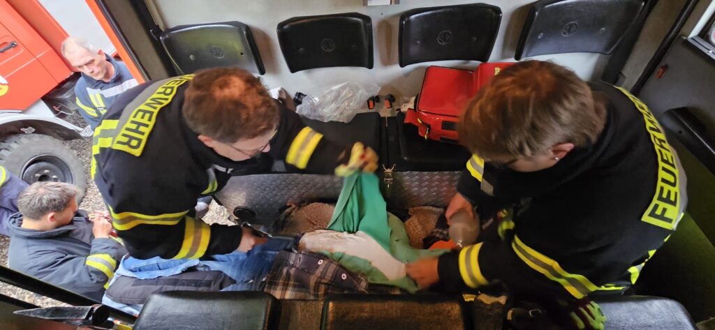 Hier wurde die Person gegen eine bekleidete Übungspuppe ausgetauscht, welche im Anschluss erstversorgt werden musste. Dabei wurde davon ausgegangen, dass die Person reanimationspflichtig und unterkühlt war. Sie musste also schnellstmöglich in das aufgewärmte Löschgruppenfahrzeug gebracht und dort möglichst schonend entkleidet werden. Wichtig ist es hierbei, die unterkühlte Person möglichst wenig zu bewegen, um zu verhindern, dass weiteres kaltes Blut aus Armen und Beinen in die Körpermitte gelangt.